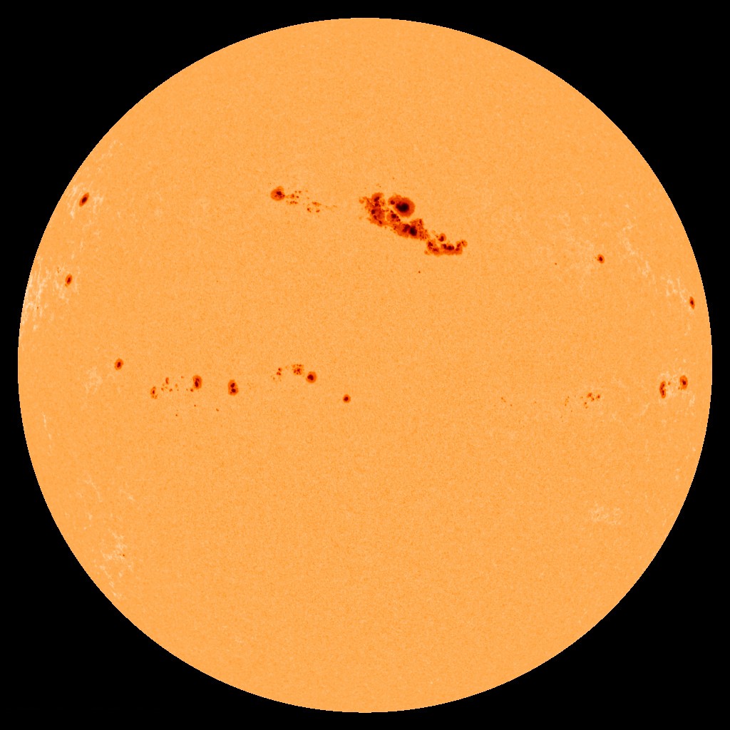 Sonne mit Flecken: 2001 März 29, aufgenommen mit dem MDI-Instrument der Sonnensonde SOHO [Quelle: esa & NASA]
